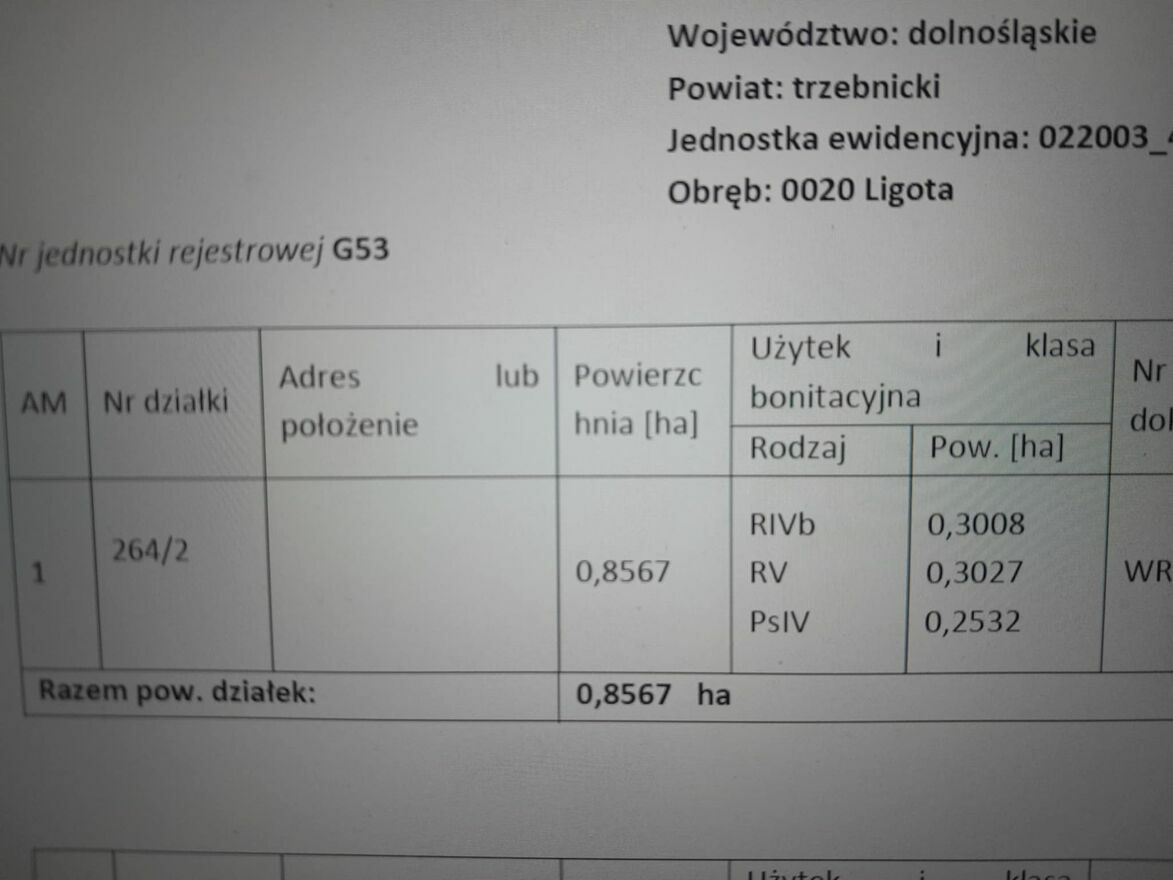 Na sprzedaż działka rolno-budowlana o powierzchni 1,0134 ha w Ligocie gm. Trzebnica.Działka budowlana (264/1) - powierzchnia 1567 m2, MPZP - zabudowa mieszkaniowa jednorodzinna, media w bliskiej odległości, na działce znajduje się słup energetyczny.